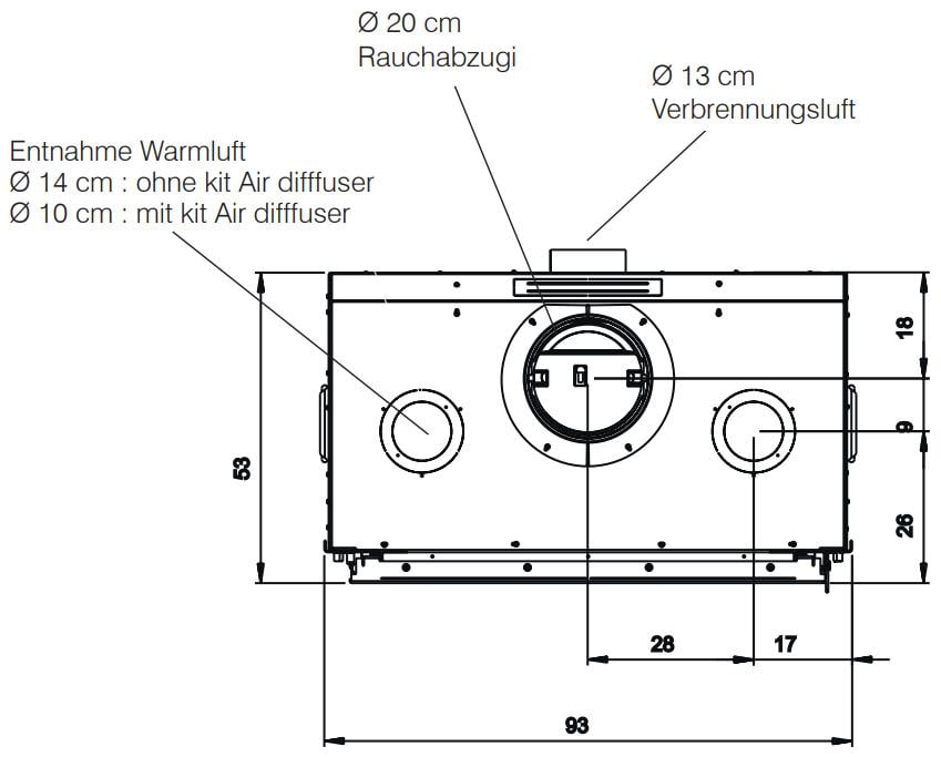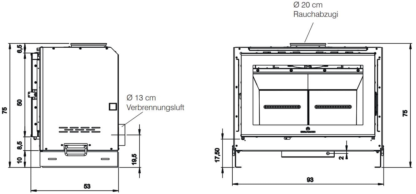 Топочная камера футерована шамотом. Топка с технологией подового (безколосникового) горения. Модель обладает всеми современными технологиями горения: вторичный дожиг газов и система "Чистое стекло". Очаг с возможностью притока воздуха извне и распределения горячего воздуха по комнатам. Для отвода продуктов сгорания необходим дымоход диаметром 200 мм.