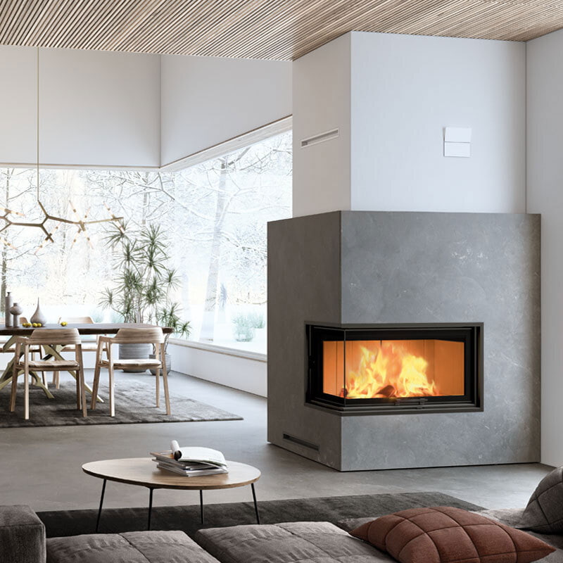 В топках используется термостойкое стекло, способное выдержать температуру до 800° C. Оно может быть прямым, двусторонним или трехсторонним. Минимальная высота расположения очага от пола — порядка 120 мм. Дверца оснащена подъёмным механизмом с современной технологией скольжения: салазки из нержавеющей стали окрашены в черный цвет, оснащены спиральными пружинами с термостойкой смазкой; перпендикулярный надвиг для безупречной герметичности; 12-слойный металлический каркас.