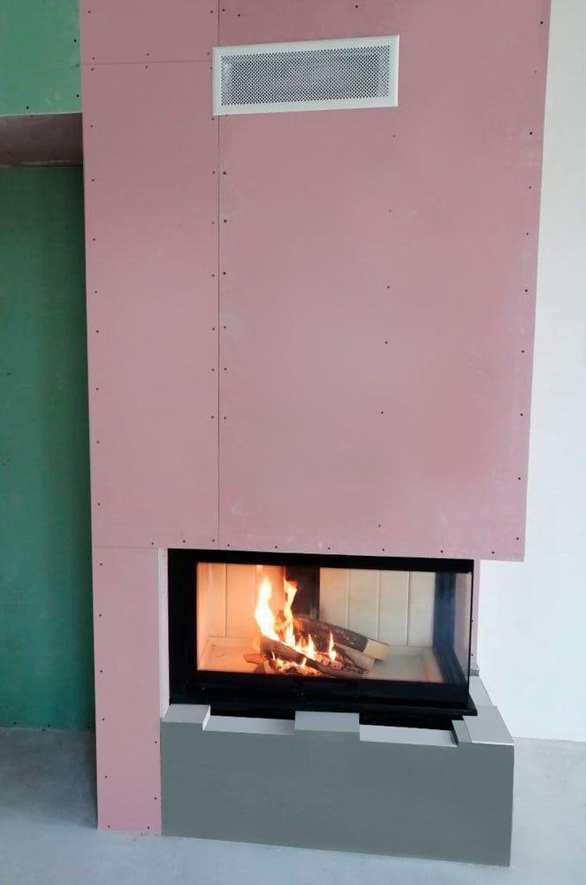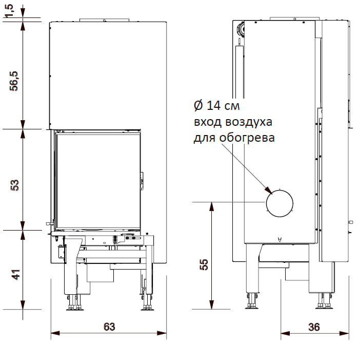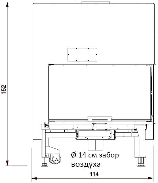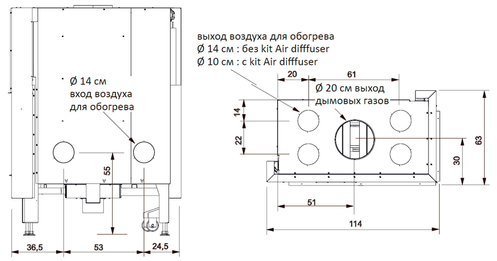 Очаг с возможностью притока воздуха извне, подключения вентилятора принудительной вентиляции, управлять которым можно с помощью пульта Д/У и распределения горячего воздуха по комнатам (конвекционных кожух). Для отвода продуктов сгорания необходим дымоход диаметром 200 мм.