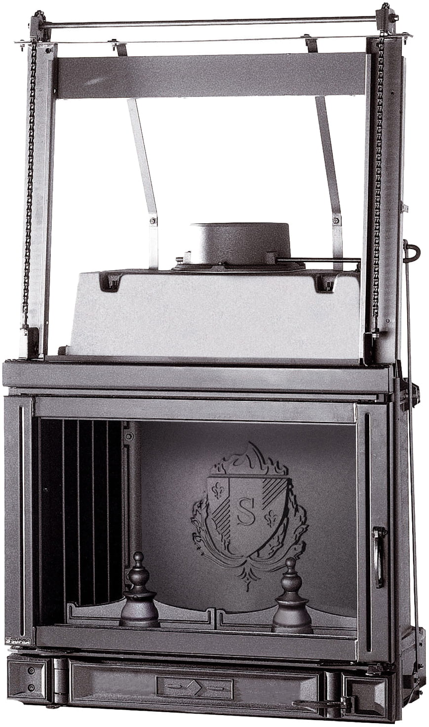 Чугунная топка с дверцей, открываемой вверх.