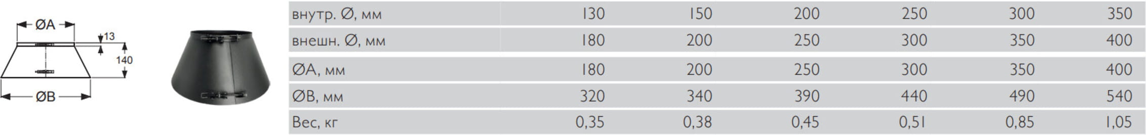 Изделие обжимает дымоход, закрывая зазор между дымоотводом и конусной частью прохода через кровлю, тем самым препятствуя попаданию осадков.