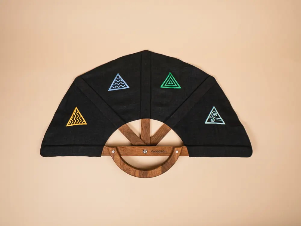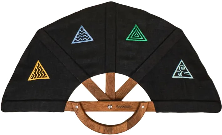 Малый веер для бани Woodson (Малый веер для бани Вудсон) предназначен для перенаправления тёплого воздуха во время парения. Ткань, выполненная из натурального льна черного цвета, украшена орнаментом природных стихий, ручка — из дуба. Элемент покрыт натуральным маслом от Woodson. Ширина модели в разложенном виде составляет 670 мм.
